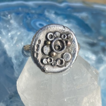 This Geode Crystal Ring was made using Silver and elements of 9ct Red and Yellow Gold and a touch of 18ct Yellow Gold.