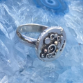 This Ring is a size O, has a bandwidth of 3mm with the front ‘Stone’ section approximately 15mm wide.